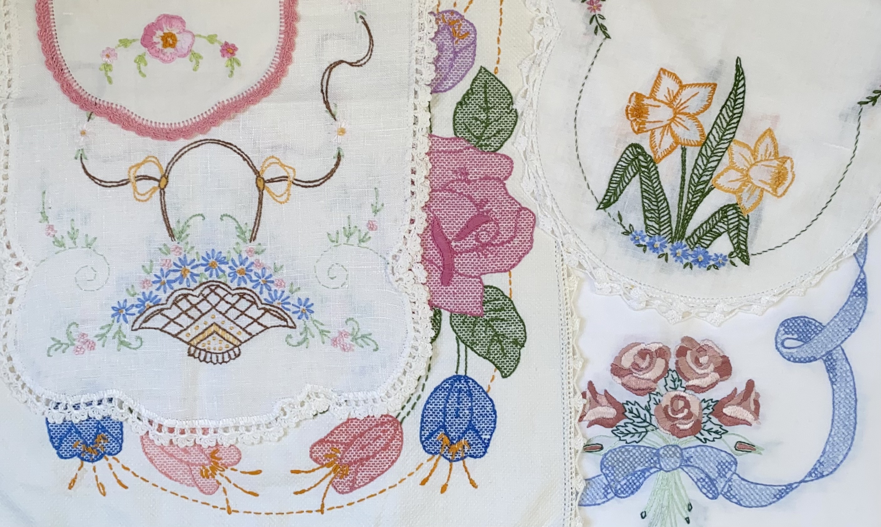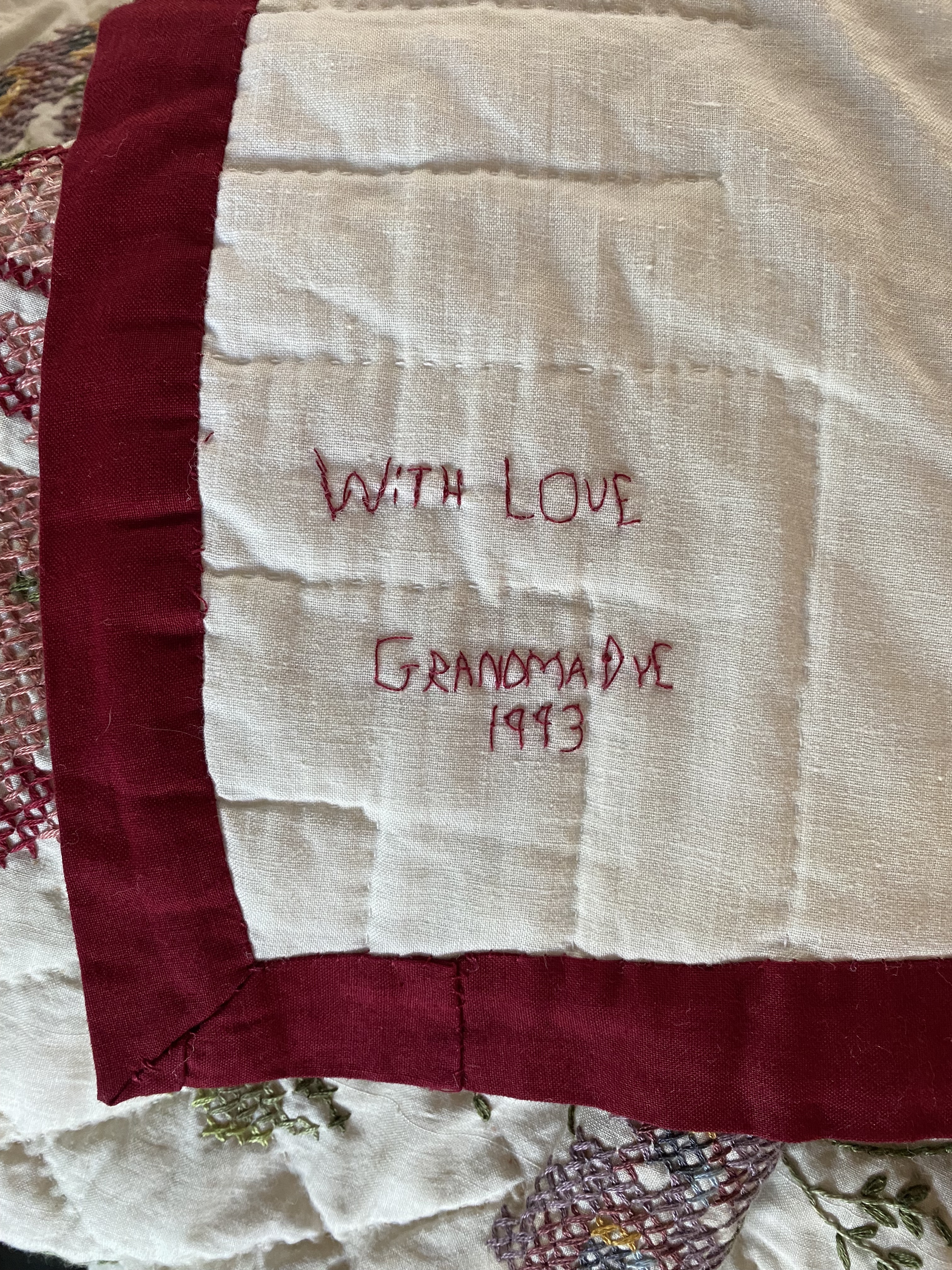 In addition to pieces such as placemats or pillows that serve practical purposes, many works have been created with special occasions in mind, which was especially helpful when it came to building out metadata. The fields “commemoration,” which applies to seven items in the collection, and “inscription,” which applies to four items, demonstrate the specific intentions behind such pieces. Events such as graduations, weddings, and births have been commemorated and memorialized in fiber form, and other pieces bear inscriptions that record the context of the work and its creator. Additionally, nine items, which can be found here or through a search for “gift” in the top search bar, were given as gifts for birthdays, holidays, or on the occasion of moving into a new space. This information was especially useful in the formation of metadata, but it also makes clear the deeply personal nature of the collection.